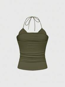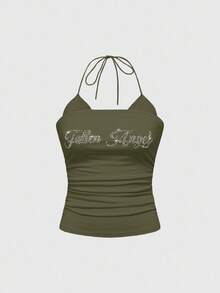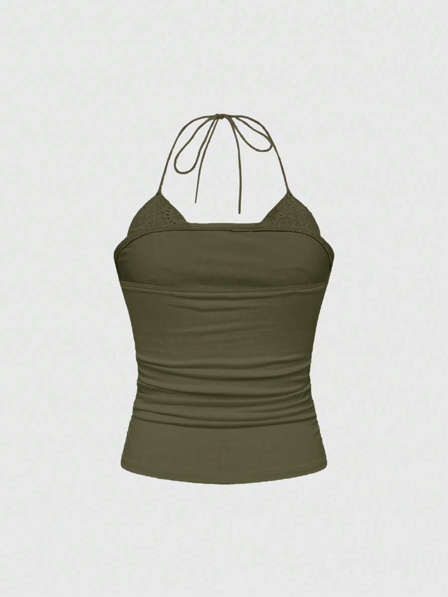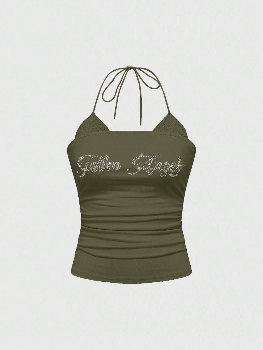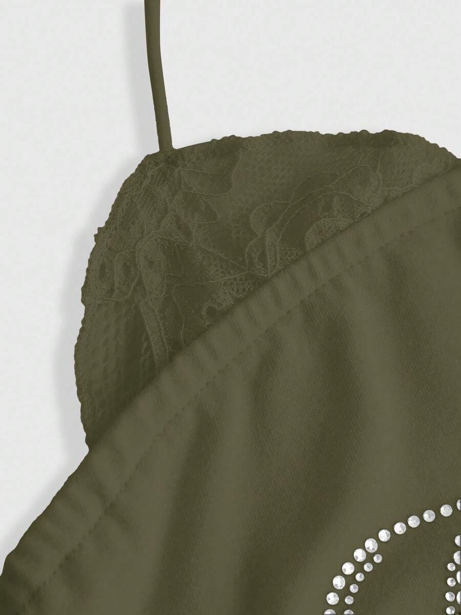 Débardeur plissé à encolure ras-du-cou orné de strass et de dentelle 2 en 1 pour femmes