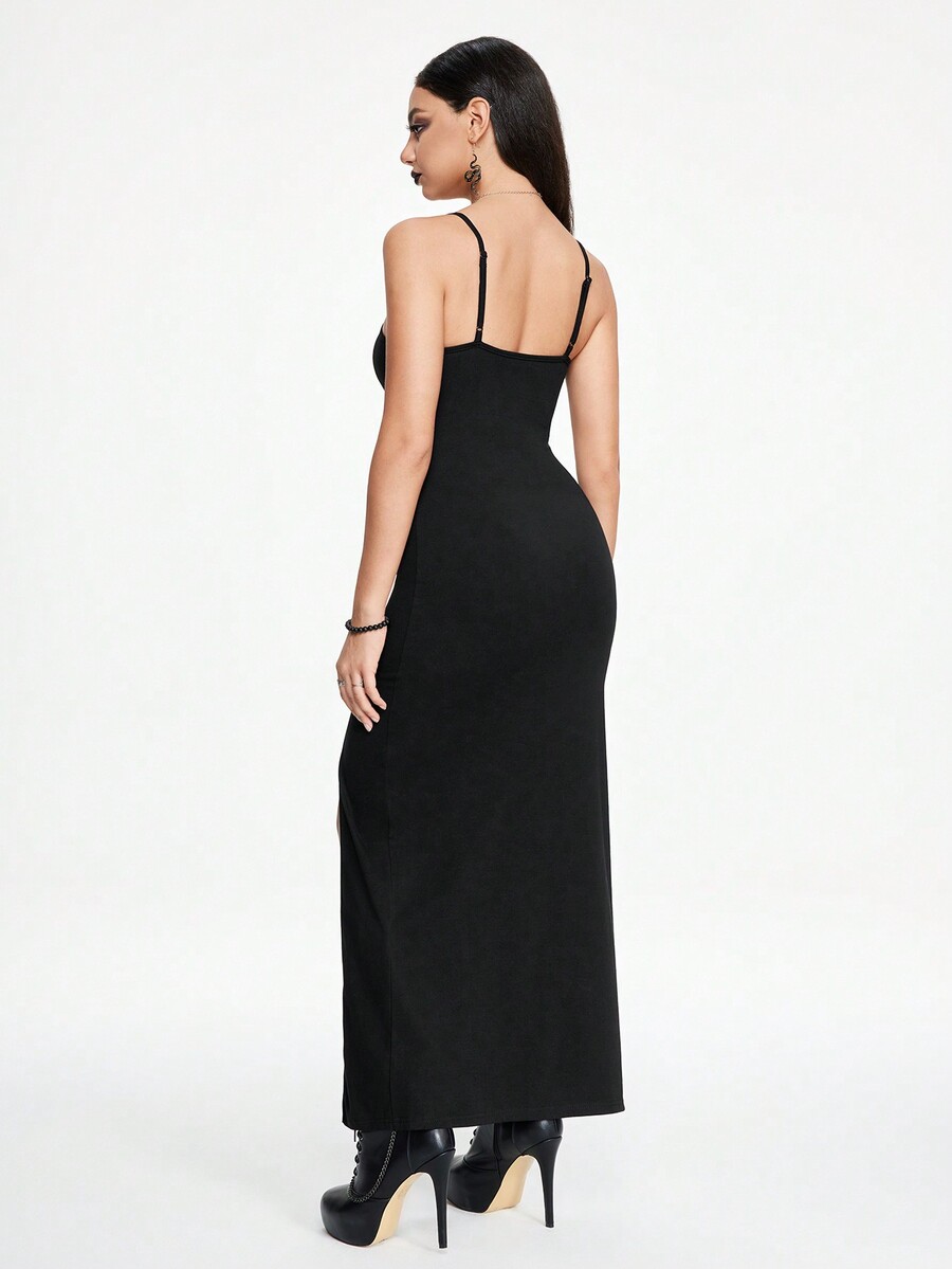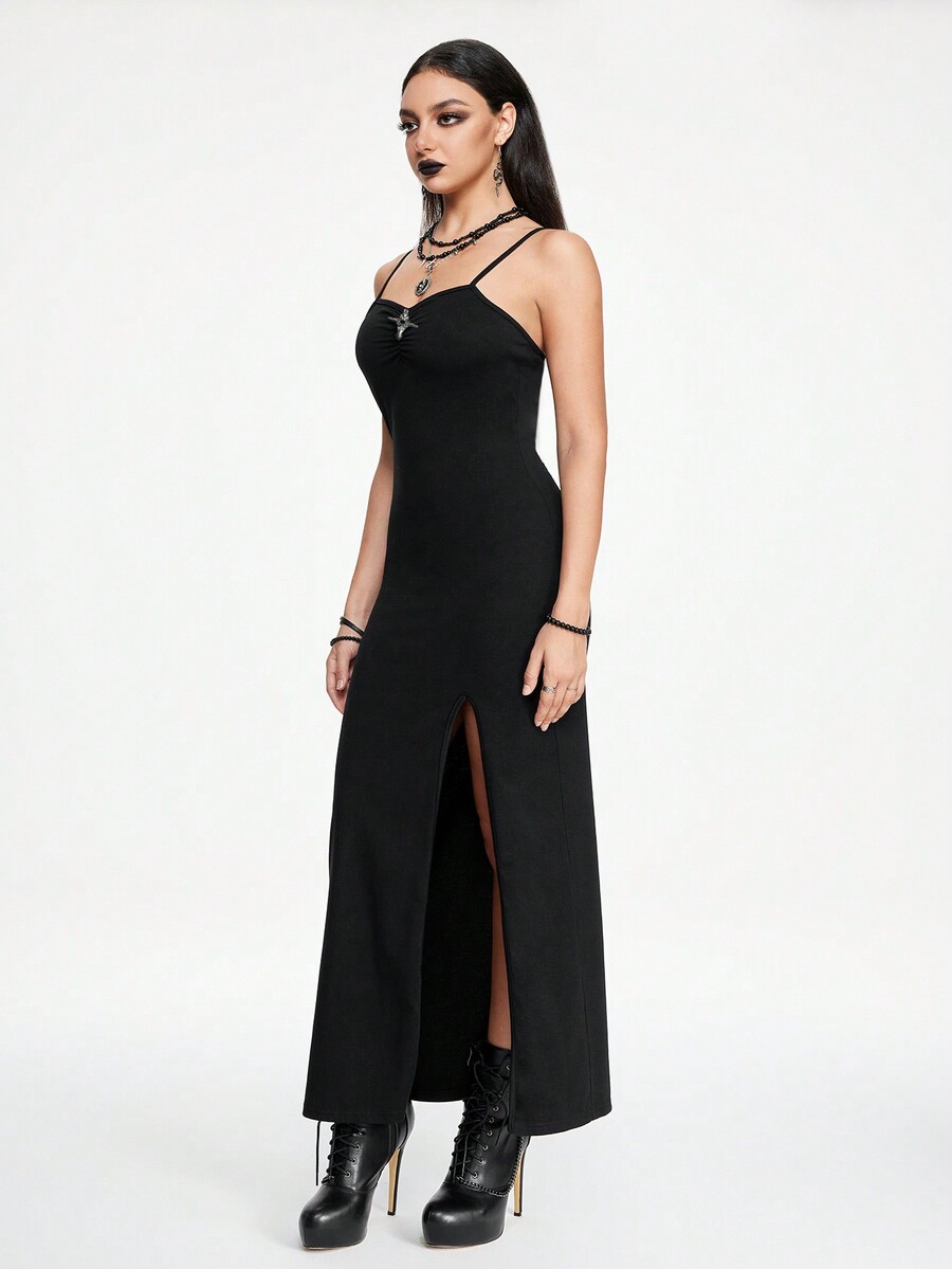 Robe fendue haute plissée au centre avec pendentif métallique en forme de serpent sexy et bretelles pour femmes, robe noire