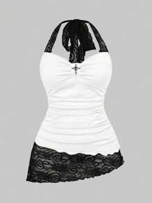 Femmes Caraco d Été en Tricot à Patchwork de Dentelle, Ourlet Asymétrique, Col Montant Noué à la Taille