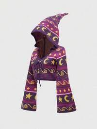 Femmes Rétro Hippie Sorcière Mystérieuse Capuche Rayée Jacquard Impression Soleil Lune Étoile Violet Évasé Manche Capuche Pull Chandail