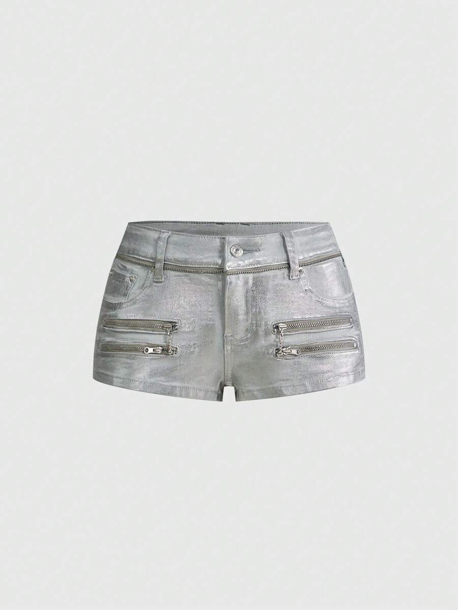 Short en jean mini taille super basse argenté brillant pour femme, tenue de festival de musique Y2K Baddie
