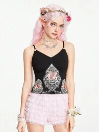 Goth Camisole Pour Femmes, Style Palais Doux Et Vintage, Peinture À Lhuile Artistique, Texture Dentelle Imprimée, Coupe Cintrée