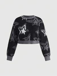 Grunge Punk Pull ample à manches longues, coupe courte, motif étoile vintage polyvalent, taille grande