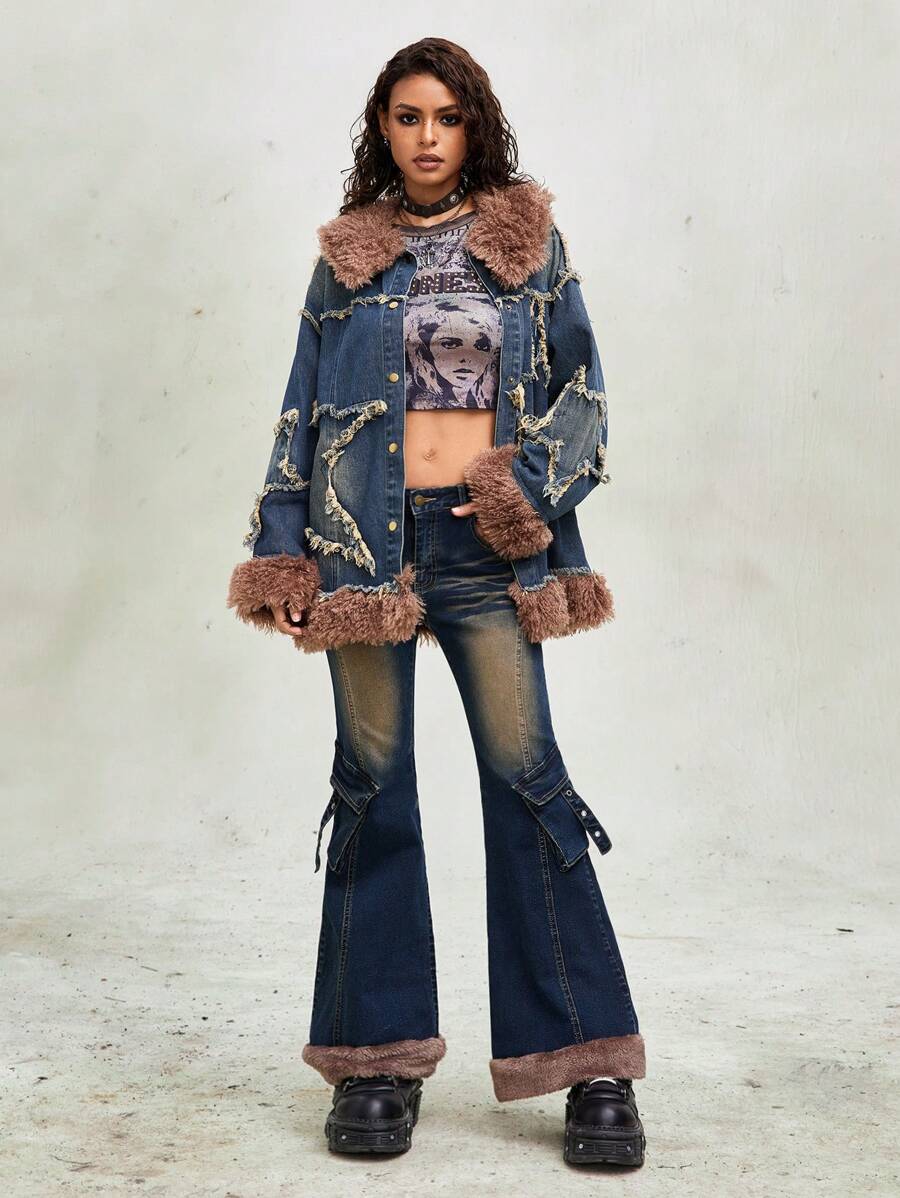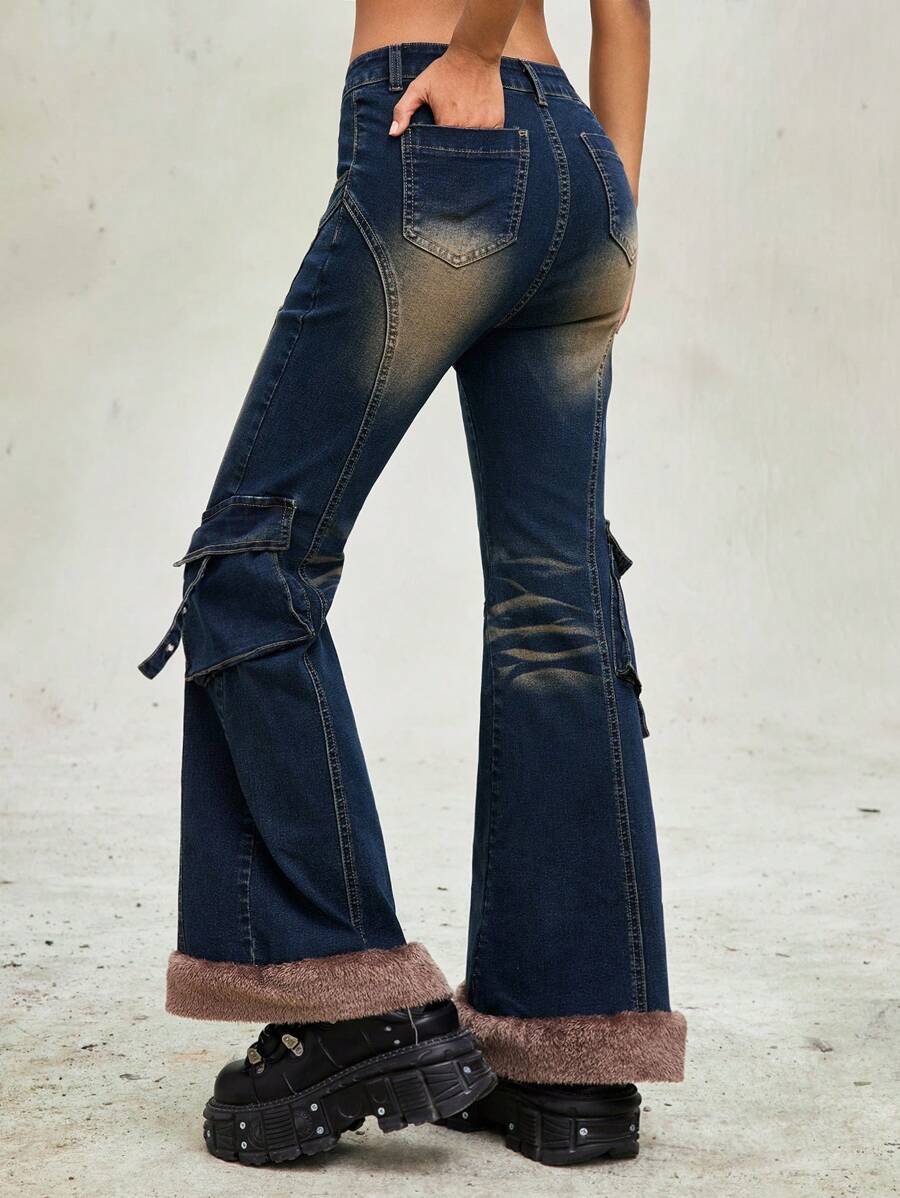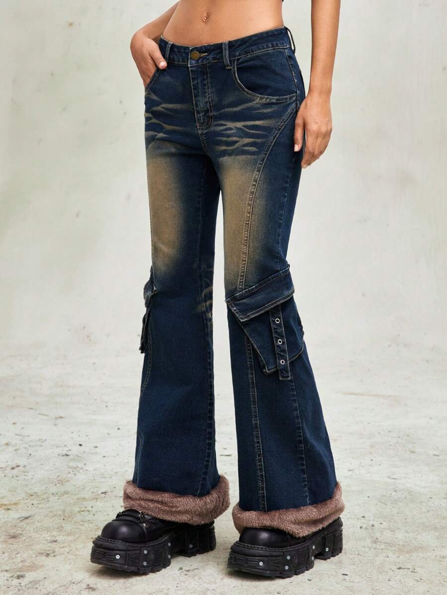 Jeans évasés slim avec ourlet pelucheux, délavés et patchwork, taille basse style Y2K