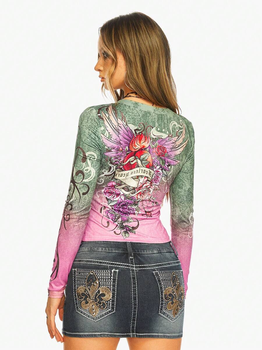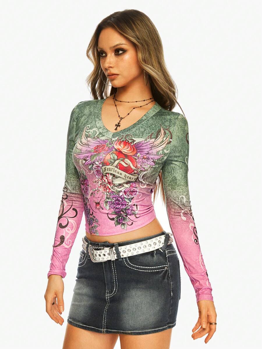 J-Fashion T-shirt manches longues femme col V à motif ailes bicolore et rose style Y2K de Shibuya Girl Abby
