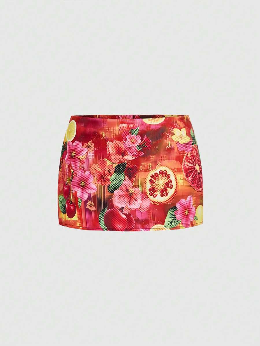 Tenue de plage estivale Y2K, mini-jupe moulante à taille basse avec imprimé fruits et cerises