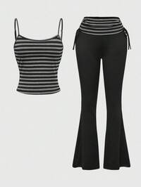 Grunge Punk Ensemble 2 pièces Top camisole rayé rétro Y2K et pantalon évasé à taille ultra basse rayé pour femmes