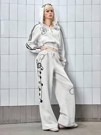 ROMWE Avant 2 pièces Ensemble de veste à capuche zippée et pantalon imprimé de notes de musique décontracté et quotidien pour femmes