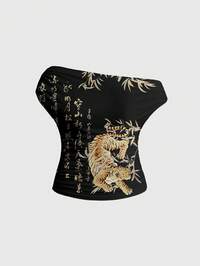 ROMWE Avant Nouveau T-shirt femme grande taille style chinois, motif tigre calligraphie punk sexy