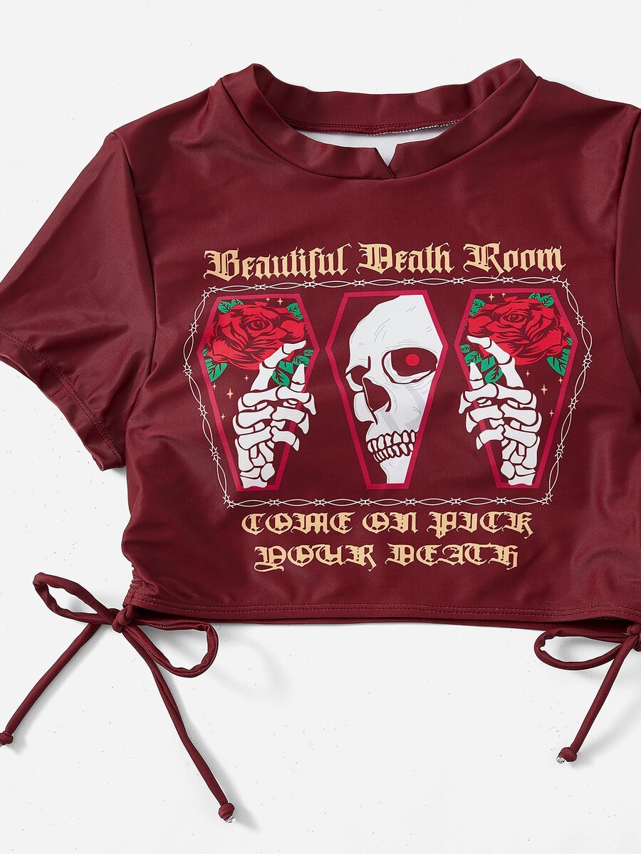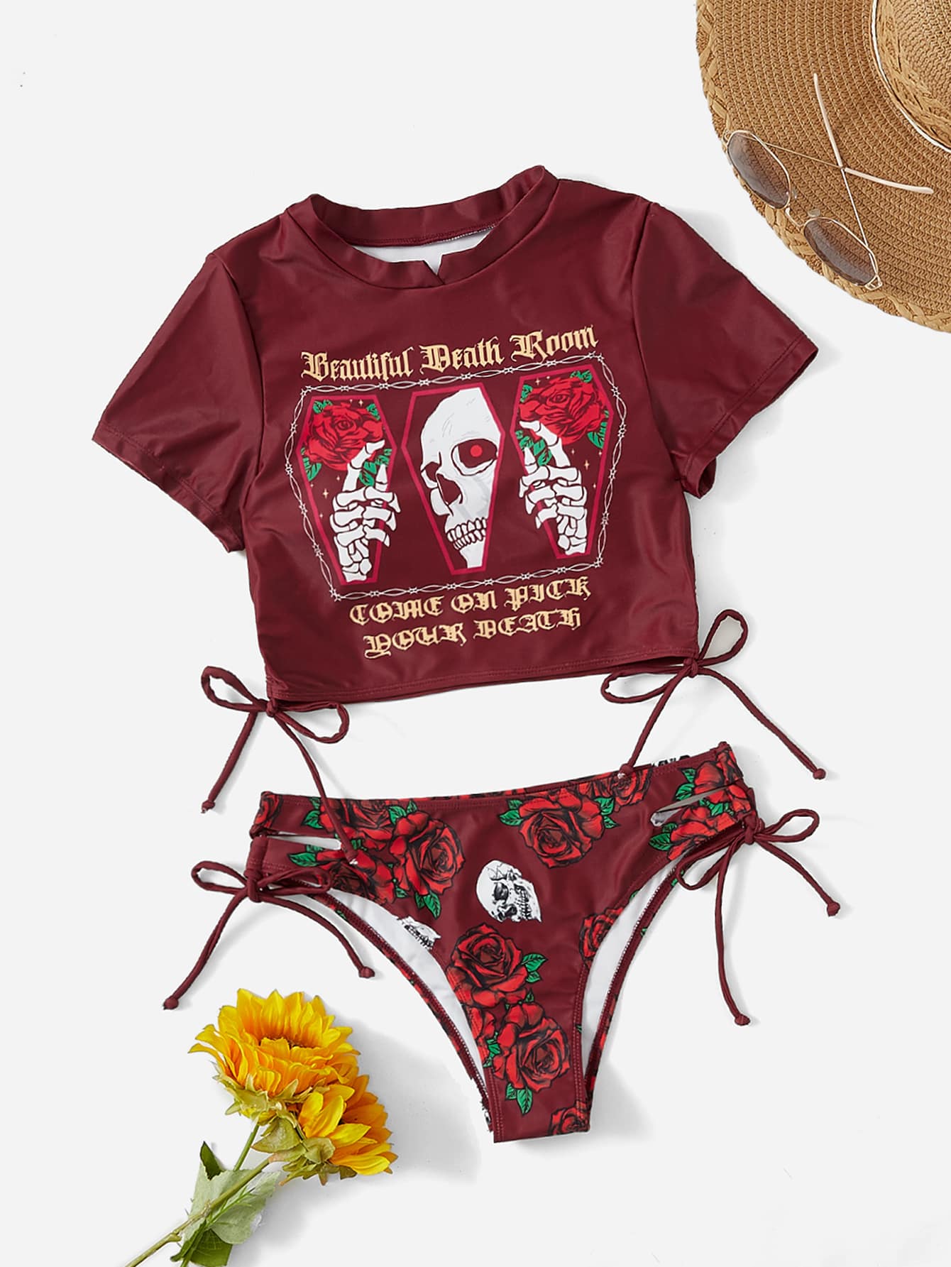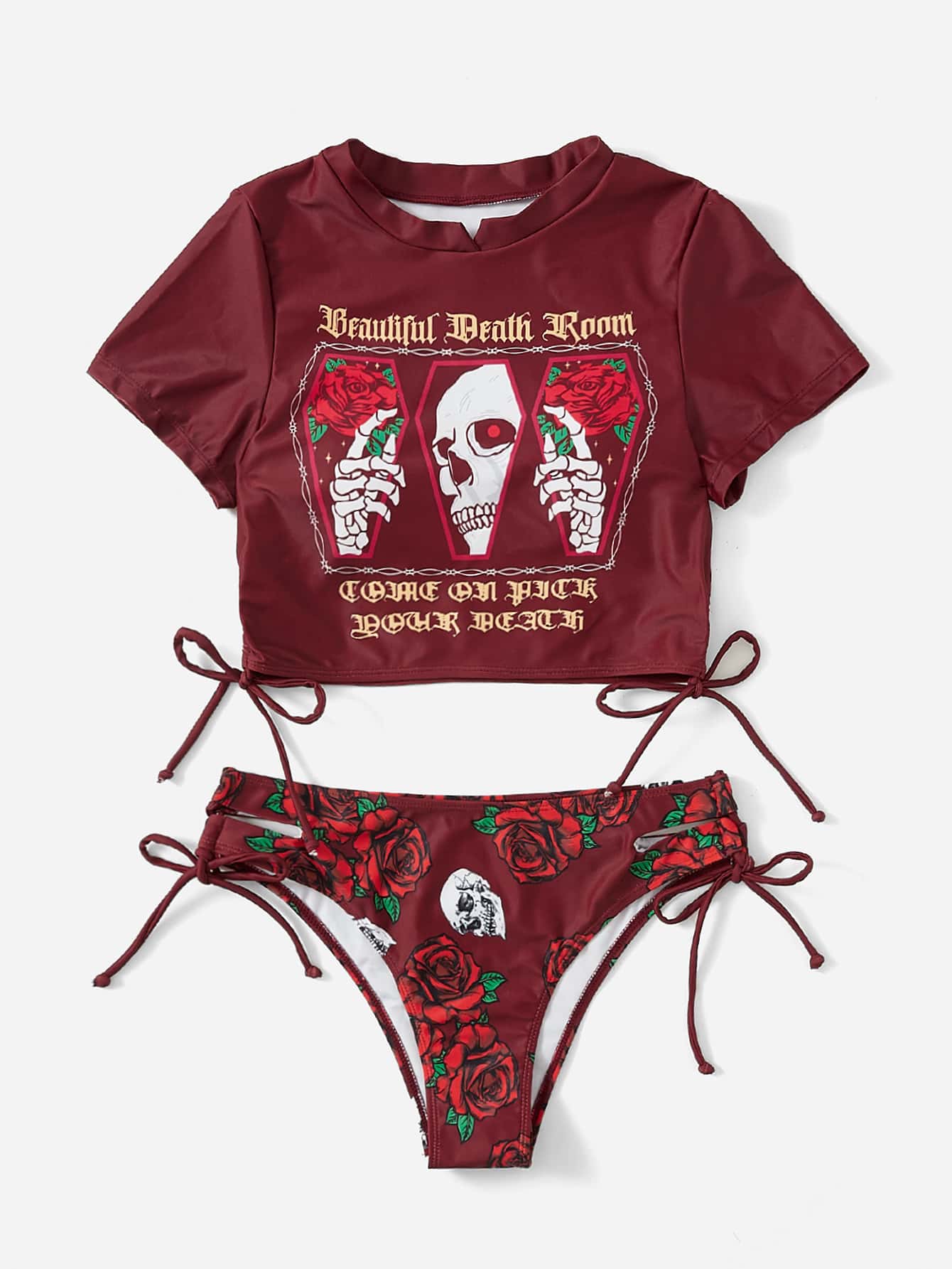 lockdsg Bikini cowgirl à cordon de serrage graphique floral et crâne avec slogan gothique