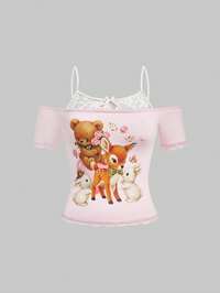 Débardeur à col ras-du-cou avec imprimé lettres et dessins animés pour femmes