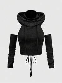 Grunge Punk Top à manches longues ajusté, style apocalyptique punk avec capuche, dos nu et cordon de serrage