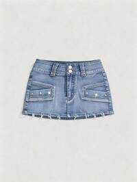 Jupe en jean mini taille très basse avec boucle métallique décorative et lavage vintage délavé pour femmes, style Y2K baddie