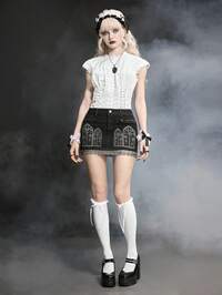 Goth Jupe mini en jean avec chaîne de taille en métal, garniture en dentelle contrastée et imprimé d'église de monastère sombre