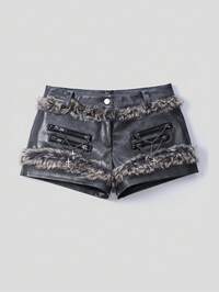Grunge Punk Short mini sexy à taille basse en patchwork de fourrure et de métal PU, style vintage Y2K