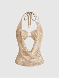 ROMWE Avant Blouse tricotée ajourée, décolletée dans le dos, avec perles, pour la plage et les vacances