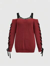 Pull oversize à encolure en V vintage rouge avec dentelle contrastante, épaules dénudées. Pull oversize grande taille, Top grande taille pour femmes