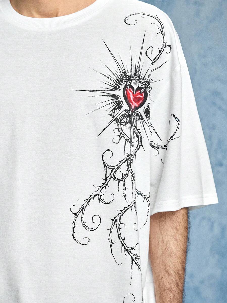 Goth T-shirt blanc à manches courtes pour homme, imprimé cœur et épines, décontracté et à la mode pour les trajets quotidiens et l'été.